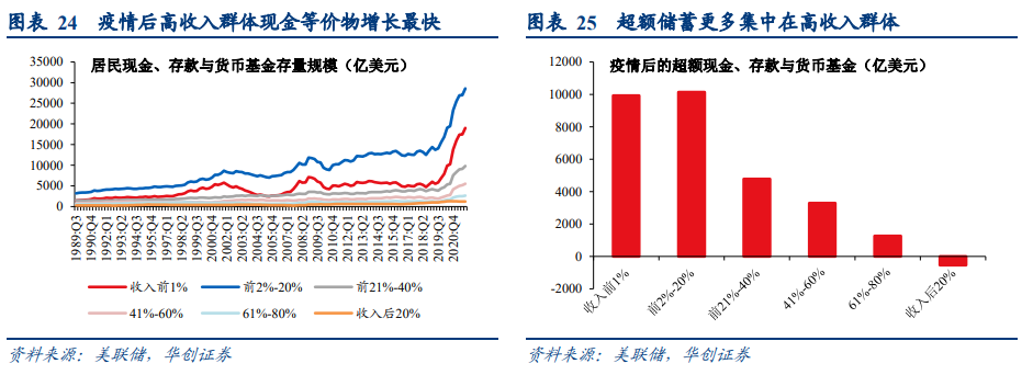 由于高收入群体的边际消费倾向MPC更低,高度不均衡的“超额储蓄”分配结构带来后续储蓄转化为消费的规模或有限。学术研究显示美国居民部门的MPC在15%-25%的区间中,而低收入群体的MPC大约为高收入群体的10倍左右[2],因此超额储蓄更多集中在高收入群体,或带来后续储蓄转化为消费的比例更低。