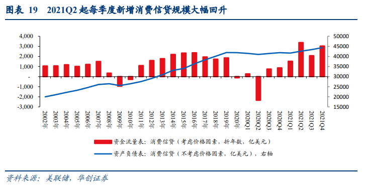 从Z.1表存量角度看(考虑价格因素),截至2021Q4,与疫情前2019年末相比,疫后居民消费贷款增长2422亿美元左右。至2021Q4美国居民部门消费贷款余额4.4万亿美元,同样在2021Q2起规模出现快速回升。