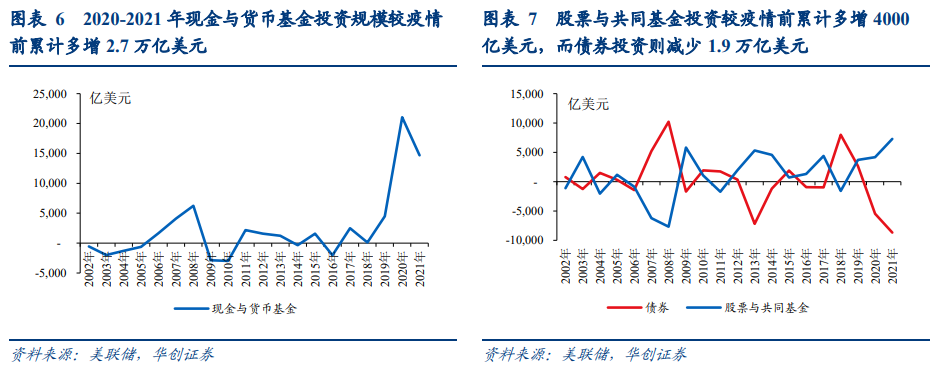 金融投资包括了现金及货币基金、债券、股票等金融资产投资,疫后现金及货币基金增量最大,债券投资则大幅收窄。疫情前,居民现金与货币基金、股票与共同基金、债券等金融资产投资规模相对稳定,2015-2019年现金与货币基金投资规模在-2000~2000亿美元区间中波动、股票与共同基金投资在-1000~4000亿美元区间中波动、债券投资在-1000~2000亿美元区间中波动,这三类资产占居民资金去向的比重也较小,仅-1%~3%左右。而疫情后,居民现金与货币基金、股票与共同基金投资规模大幅提升:2020-2021年现金与货币基金投资规模提升至2.1、1.5万亿美元,较2019年累计多增2.7万亿美元;股票与共同基金投资规模提升至4200、7300亿美元,较2019年累计多增4000亿美元。而2020-2021年债券投资规模则大幅缩水至-5500、-8700亿美元,较2019年累计减少1.9万亿美元。