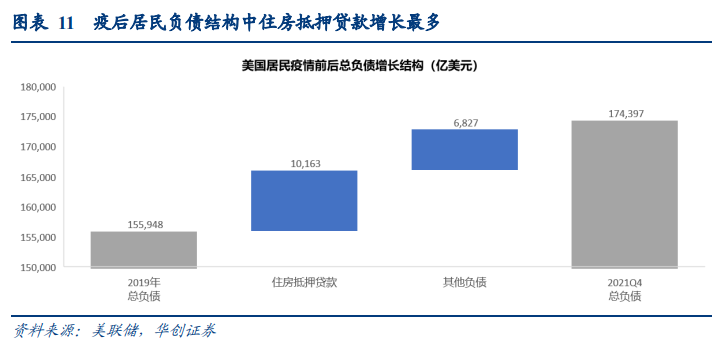 负债端:居民负债来源主要为各类贷款,疫后居民的总负债扩大1.8万亿美元至17.4万亿美元,其中住房抵押贷款扩张1.3万亿美元;消费信贷在疫情初期明显回落,2021Q2起显著回升,截至2021Q4累计扩张2422亿美元。