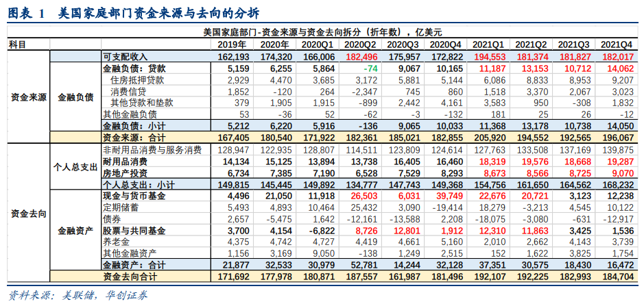 基于美联储发布的Z.1表中家庭部门资金流量表(数据为流量、经季调折年数、剔除价格因素),我们可对家庭部门的资金来源(有多少钱)与资金去向(钱去哪儿)进行如下拆分。