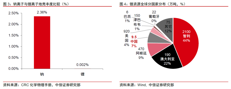钠离子电池主要电荷载体的钠离子地壳丰度约为2.36%,远高于锂离子的0.002%,资源储备丰富,同时各个国家可以采用海水制备钠盐,因此资源分部均匀。