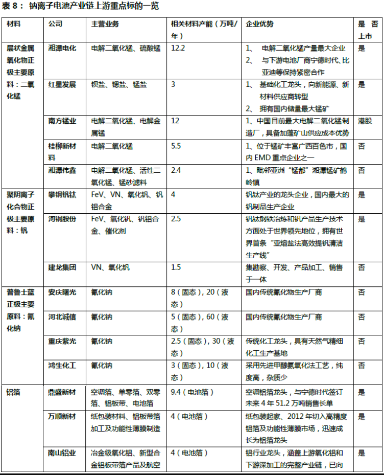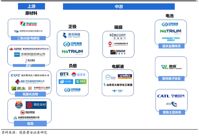 相关公司方面,国泰君安表示,钠离子电池产业链预计2023年成形,同时由于产业链结构同锂电高度类似,中游锂电厂商具备先发优势,主要变动在上游原材料,上游传统化工企业迎来转型契机。