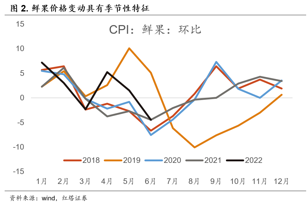 第四,随着疫情冲击减弱后,物流运输逐渐畅通以及居民的囤货需求减弱叠加蔬菜、水果等进入供给旺季,大部分食品项的价格明显回落。6月食品价格环比下降1.6%,降幅比上月扩大0.3个百分点,影响CPI下降约0.30个百分点,其中鲜菜、鸡蛋、鲜果和水产品价格分别下降9.2%、5.0%、4.5%和1.6%。