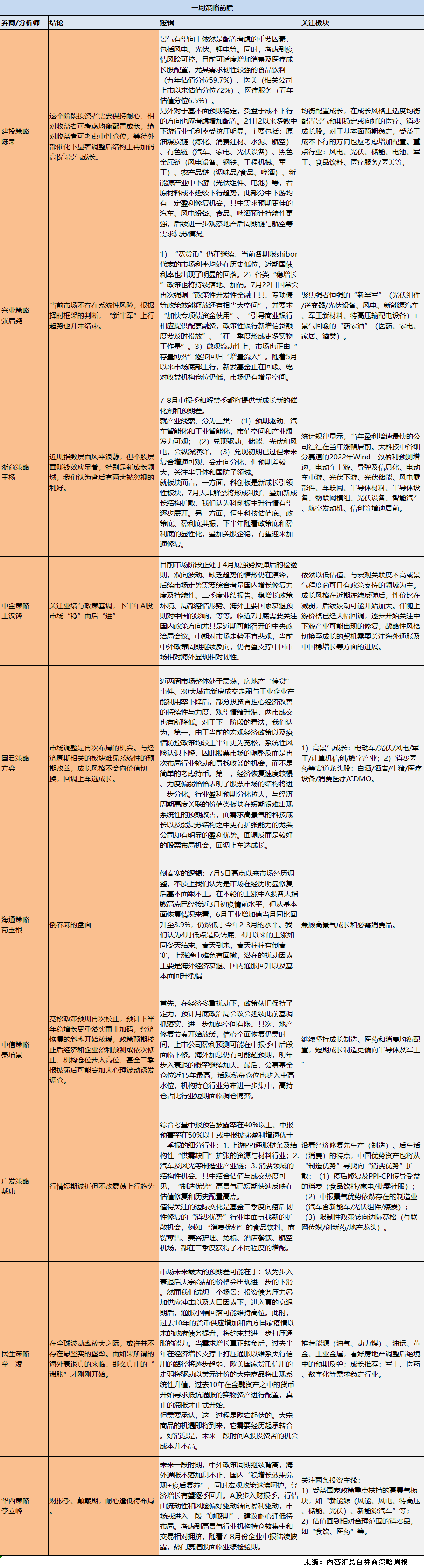 本周策略分析师依旧看指数震荡行情,方向上高景气赛道依旧是首选,中报净利润断层和下半年边际好转的板块与公司也有提及。