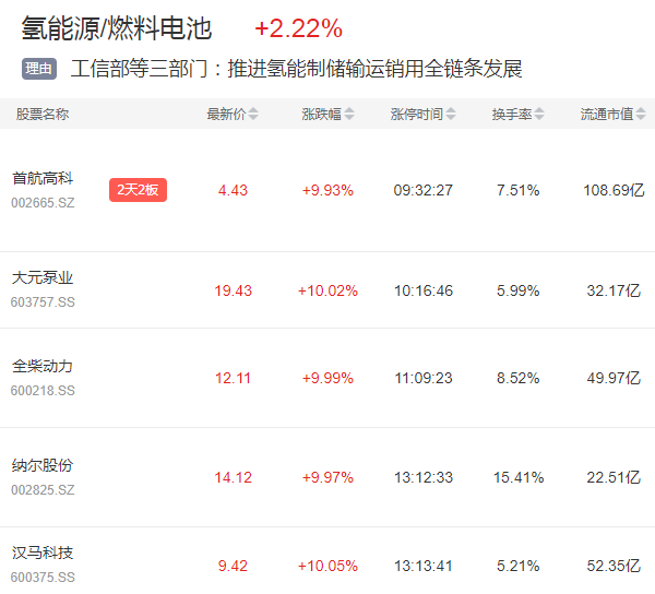 消息面上,早盘工信部、国家发改委、生态环境部三部门印发《工业领域碳达峰实施方案》提出,要推进氢能“制储输运销用”全链条发展。