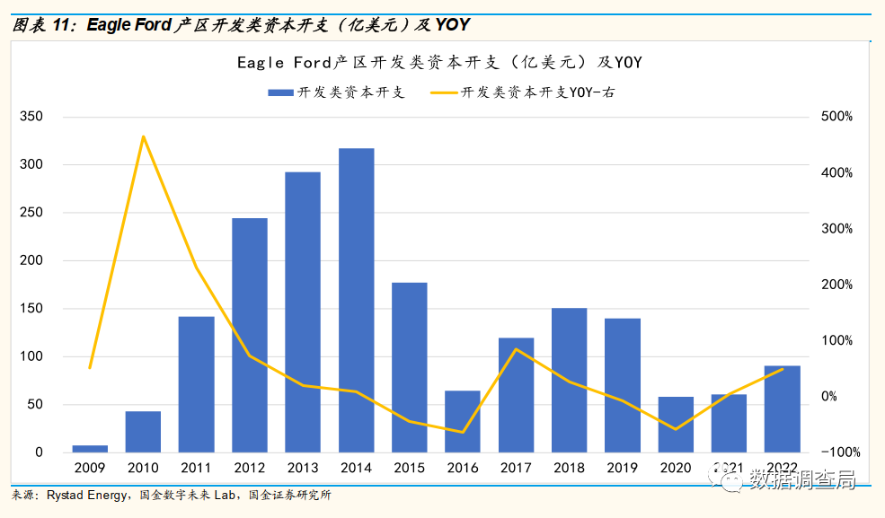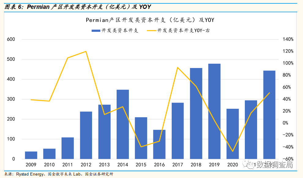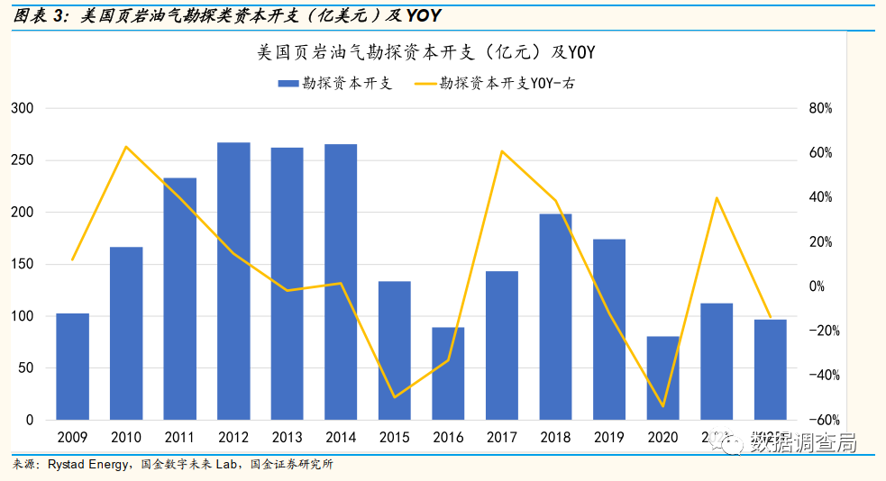 美国页岩油气总资本开支增长隐藏勘探开支下滑这一重大风险。通过梳理美国页岩油气2009年至今合计12年的资本开支结构,2021年和2022年美国页岩油气资本开支分别同比增长19%和34%,但我们通过对美国页岩油气资本开支结构的拆分发现,美国页岩油气勘探类资本开支2021年同比增速为40%,2022年却同比下滑14%,而开发类资本开支2021年和2022年同比增速分别为15%和43%,这意味着用于增加短期产量(2022年-2023年产量)的开发类资本开支则大幅增长,用于中长期资本产能资本开支增长有限甚至出现下滑,美国当前页岩油气资本开支结构存在巨大风险。