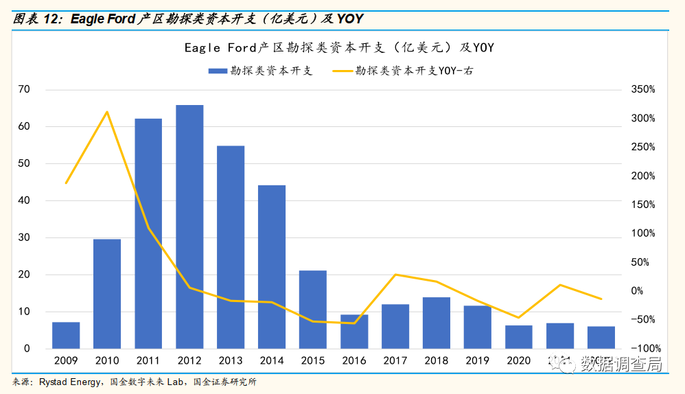 两大页岩油气主力产区勘探开支显著负增长,中长期供应能力恶化。美国两大页岩油气主力产区Permian和Eagle Ford资本开支结构同样呈侧重于用于短期释放产量的开发类资本开支。Permian产区资本开支2021年和2022年分别同比增长22%和33%,其中开发类资本开支2021年和2022同比增速分别为17%和51%,勘探类资本开支2021年同比增速47%,但2022年同比出现大幅下滑,下滑幅度近30%。Eagle Ford产区同样显示出这一趋势,2021年和2022年总资本开支分别同比增长5%和43%,其中开发类资本开支2021年和2022同比增速分别为5%和49%,勘探类资本开支2021同比增长11%,但2022年同比下滑13%。