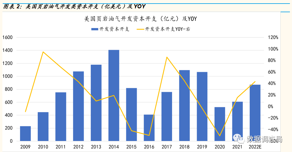 通过梳理美国页岩油气2009年至今合计12年的资本开支结构,我们发现,2021-2022年美国页岩油气资本开支处于持续恢复过程中,其中2021/2022年资本开支分别同比增长19%/34%,但我们通过对美国页岩油气资本开支结构的拆分发现,发现美国页岩油气资本开支结构存在巨大风险,美国2021/2022年勘探资本开支同比增速分别为40%/-14%,而开发资本开支2021/2022年同比增速分别为15%/43%,用于增加短期产量(2022-2023产量)的开发类资本开支则大幅增长,用于中长期资本产能资本开支增长有限甚至出现下滑,美国油气或存在中长期供应不足风险。