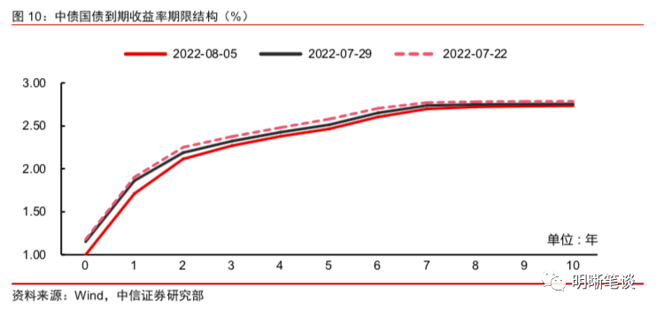 短期资金面仍将保持宽松。虽然隔夜利率难以进一步下行,但是短期内资金面仍将保持宽松,主要原因在于:一方面,当前实体部门融资意愿依然较弱,信贷投放面临阻力,资金淤积在银行间市场的情况可能仍将持续一段时间。部分城市疫情有所反复,企业生产经营计划受到一定的影响,房地产市场风波再起,居民加杠杆意愿较低;另一方面,目前专项债发行高峰期已过,预计8月份政府债供给对于资金面的冲击不大,同时财政支出使资金从国库流回银行体系,向市场吐纳流动性,尤其是当前稳增长压力较大的情况下,支出端发力更加明显,月末大量的财政支出有望保障三季度流动性整体较为充裕。