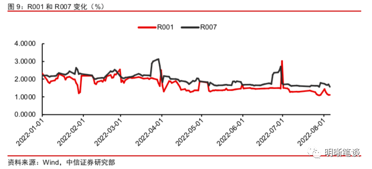 资金利率持续下行,隔夜资金利率创18个月新低。自今年4月以来,市场资金面持续宽松,除跨月时间点外,资金利率整体维持低位运行。7月27日,DR001盘中跌破1%,当日加权平均利率为1.0029%;R001当日加权平均利率为1.0881%;隔夜Shibor报1.008%。三者同时创下2021年1月中旬以来新低。虽然后续有所回升,但仍然明显低于政策利率,截至8月5日,DR001为1.21%,R001为1.29%;DR007为1.56%,R007为1.66%。