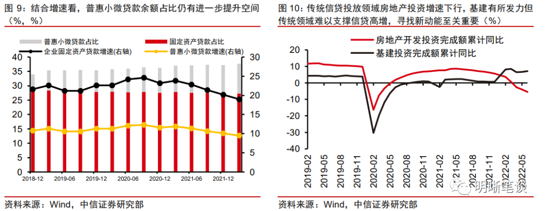 制造业贷款和普惠小微贷款是未来信贷政策关注重点。2021年“十四五”规划提出“保持制造业比重基本稳定”以来,制造业贷款占比从9%企稳回升至2022年6月的9.4%,对制造业的信贷支持助推了制造业增加值占GDP比重的筑底企稳。普惠小微贷款成为二季度央行通过信贷政策支持实体经济的重要渠道,央行通过支农支小再贷款、普惠小微贷款支持工具等结构性货币政策工具定向投放信贷资源,助力小微企业抵御风险,增强市场活力。