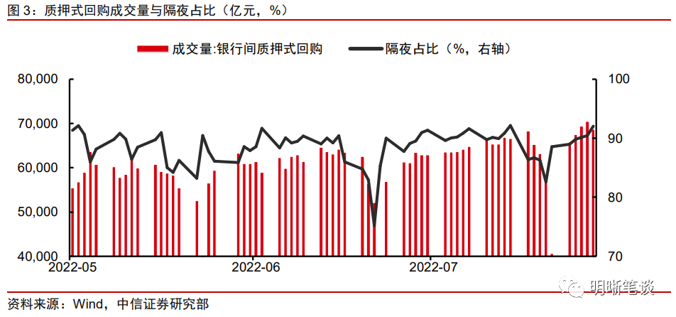 (1)二季度以来资金利率长期低位运行,资金淤积有所显现。自今年4月以来,市场资金面持续宽松,除跨月时间点外,资金利率整体维持低位运行。7月27日,DR001盘中跌破1%,当日加权平均利率为1.0029%;R001当日加权平均利率为1.0881%;隔夜Shibor报1.008%。三者同时创下2021年1月中旬以来新低。二季度以来,资金面维持宽松的原因是央行上缴利润、财政留抵退税和加大支出力度、信贷需求不足等多重因素的共同结果,DR007与7天逆回购操作利率有较大幅度偏离,银行间出现了资金淤积的迹象。货币市场资金供给充足,资金淤积在银行间市场,在一定程度上也造成了一些市场风险。