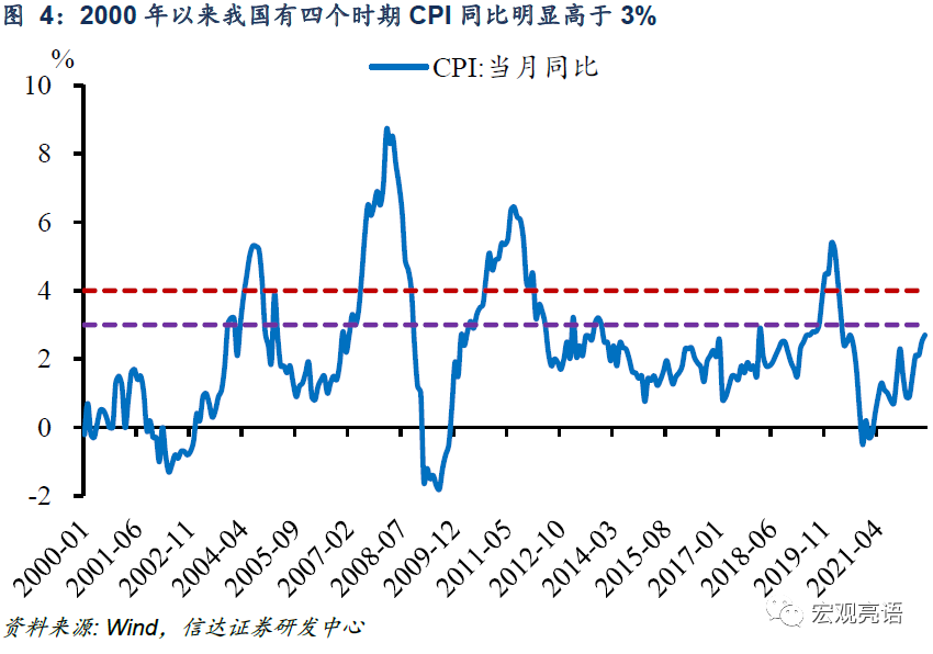 历史上同一通胀率但经济承压时,稳物价会暂时让位稳增长。2000年以来我国有四个时期 CPI同比明显高于 3%,前三个时期 200311-200410、 200703-200810、 201005-201205均属于 “经济好 +通胀高 ”的典型组合,货币政策优先稳物价。而当经济出现明显下行压力时,譬如 201909-202004时期, “稳物价 ”会让位于 “稳增长 ”。