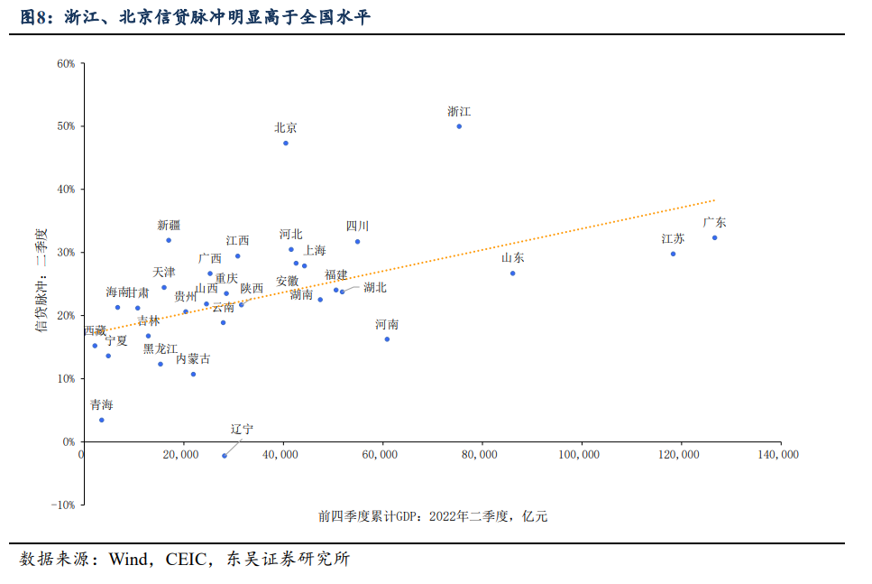 具体来看,浙江、北京等地社融规模多于其经济体量占比。根据各地区GDP与社融占比情况,8个省市的占比偏差超过1个百分点,其中浙江、北京、江苏、广东、四川社融占比较多,而辽宁、河南、内蒙古则明显偏少(图7)。若以信贷脉冲指标作比较,各地社融占比问题则更加明显,共计8个省市的信贷脉冲高于全国水平,其中浙江、北京最为明显(图8)。