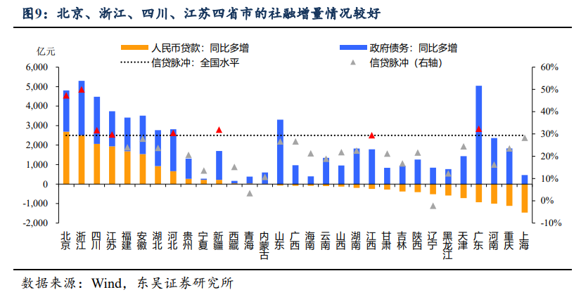 结合人民币贷款占比以及各地信贷脉冲情况来看,总量佳、结构好的省市分别为北京、浙江、四川、江苏,预计能对全国经济增长形成一定支撑。