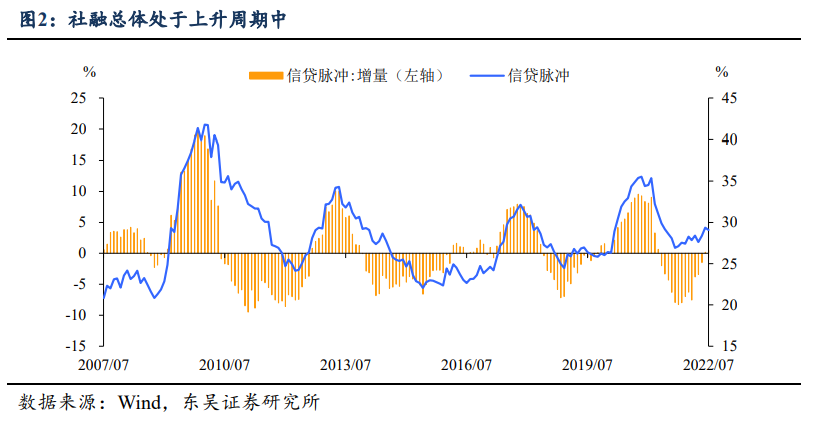 信贷脉冲正处上行周期,自2021年三季度触底回升。随着信贷政策发力,此后这一指标开始回升,并于今年6月份开始出现同比多增,即便考虑到7月社融数据的转弱情况,信贷脉冲指标也较去年同期上升0.48个百分点(图2)。