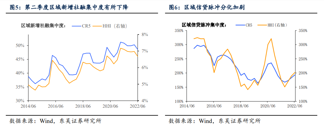 然而,考虑到各地经济增长潜力的不同,以信贷脉冲指标作比较,各地差距在2021年末触及阶段性底部后有所加大。二季度信贷脉冲差额进一步上升,HHI上升近12.1个百分点。上海、江苏信贷脉冲指数出现下滑,与社融占比不同,浙江、北京的信贷脉冲进一步上升。(图6)