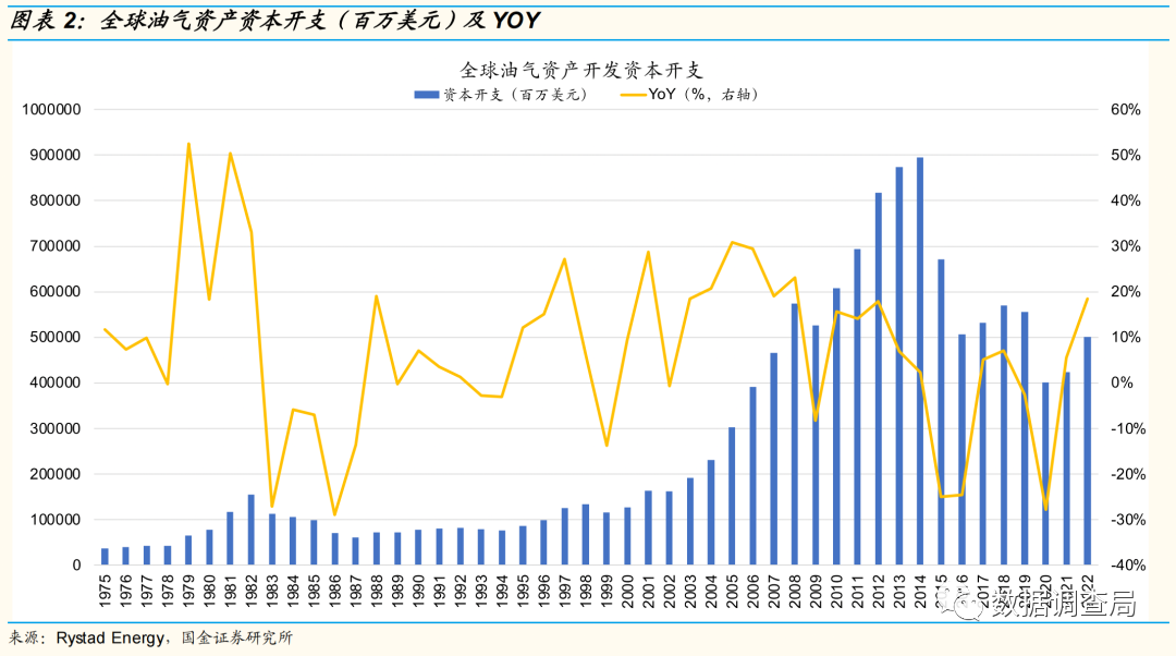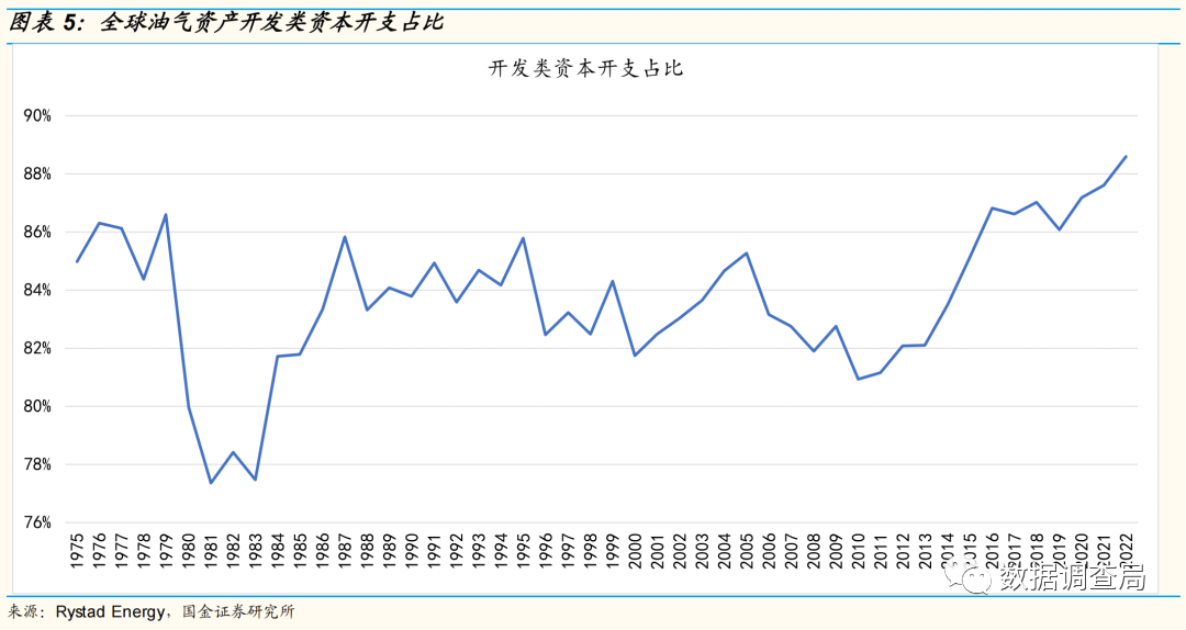 我们梳理了全球油气资本开支,其中全球油气资本开支预计2022年同比增长18.43%,但用于开发类的资本开支占比近89%,达到了1970年以来最高,开发类资本开支2022年预计增幅达19.78%,勘探类资本开支同比增速预计仅为8.9%,着眼中长期产能的勘探类资本开支增幅远低于开发类,进一步说明供应长期紧张局面或加剧。