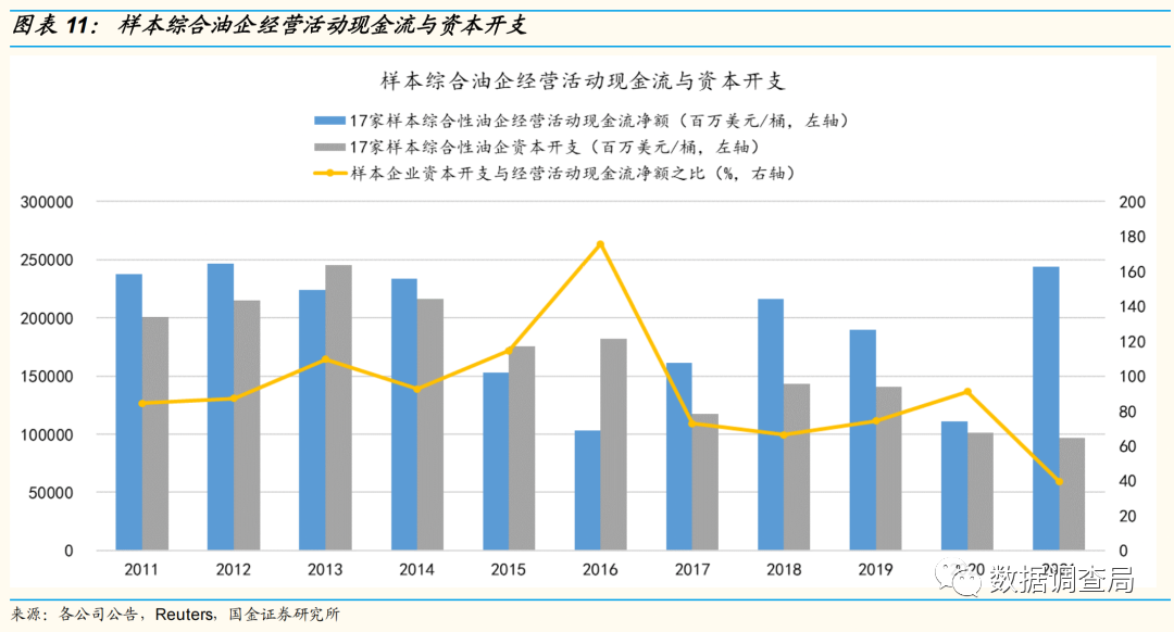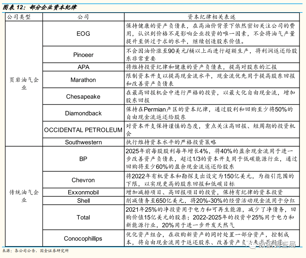 与此同时,我们统计了样本页岩油企业与传统油气企业资本开支计划,资本开支与经营性活动现金流比值变化趋势,以及部分油气企业的资本开支纪律,均显示出油气企业资本开支意愿较为有限。