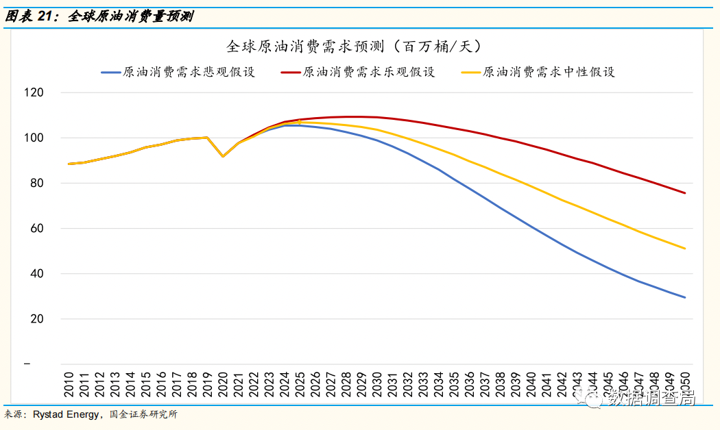 参考Rystad Energy预测,在中性假设下(全球温度上升1.8摄氏度)全球原油消费预计2030年以后全球原油消费才相较于2022年出现下滑,2022-2030年复合增速为0.4%;在乐观假设下(全球温度上升2摄氏度),全球原油消费预计2030年以前持续维持增长趋势,2022-2030年复合增速约为1.05%;即使在悲观假设下(全球温度降低1.6摄氏度),截止2030年以前全球原油消费需求也并未较2022年出现显著下滑,2022-2030年全球原油消费需求在悲观假设下复合减少量仅为0.3%。