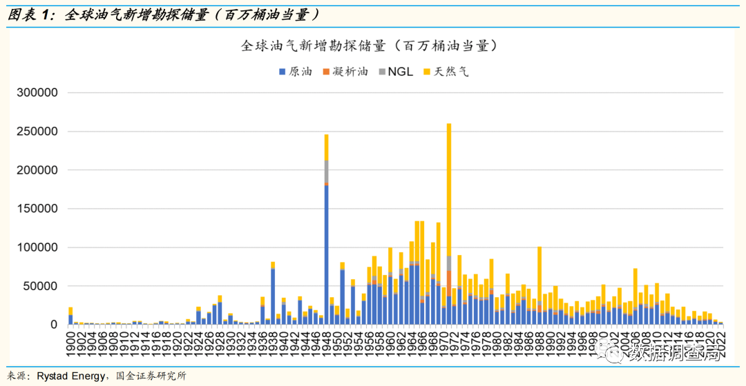 全球新发现资源量迅速下滑揭示全球油气开发资金投资油气勘探意愿和新发现资源能力的持续下行,或持续造成全球油气供应端边际增量有限原因。我们统计了1900年以来共121年全球油气新发现资源量数据,2021年全球新增油气勘探储量约为67.56亿桶油当量,为1946年以来近75年最低值。