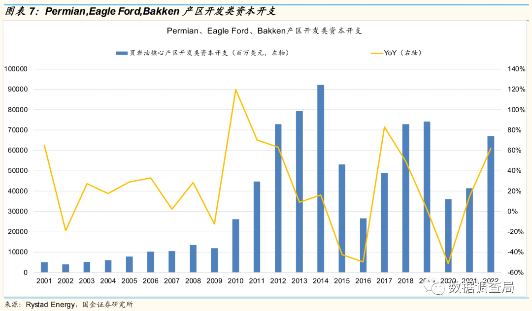 此外,我们梳理了关键供应增量来源的页岩油气关键产区Permian, Eagle Foed, Bakken的资本开支,其中用于开发类的资本开支2022年增速61.9%,但勘探类资本开支逆势下滑21.11%,着眼中长期产能的勘探类资本开支增幅远低于开发类甚至是负增长,进一步说明供应长期紧张局面或加剧。