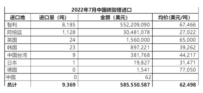 而中国海关数据显示,2022年7月,我国碳酸锂进口量为9369吨,同比上涨108%;进口均价为62498美元/吨,同比上涨878%。