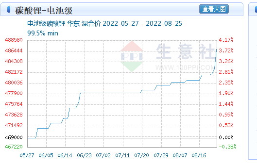 据上海钢联发布数据显示,8月24日电池级碳酸锂均价涨3500元/吨至49.10万元/吨,已逼近50万元大关。另外生意社数据同样显示近期碳酸锂价格加速上涨。