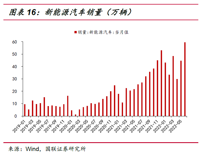 3、新能源汽车:2022年前5个月新能源汽车销售量达到259万辆,是2019年同期的4.1倍,即便和2021年同期相比,也高增了2.2倍。在行业销量高增下,新能源汽车也成为二级市场最强赛道之一。