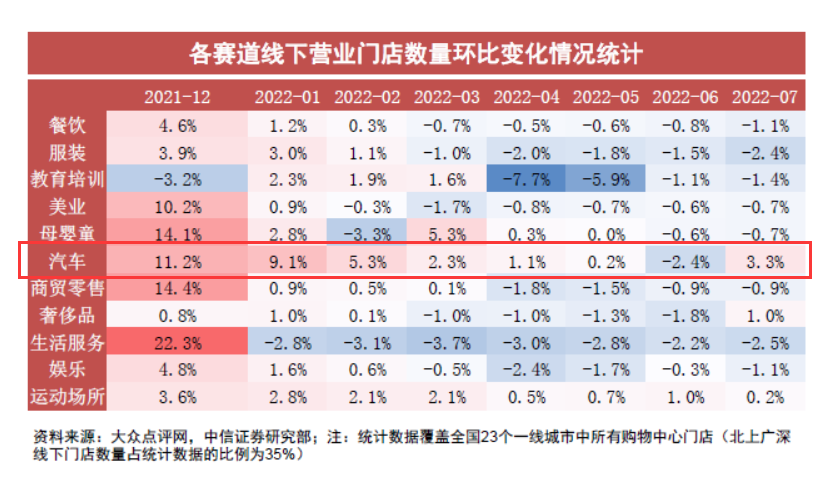 另据中信证券的统计,从1-7月来看,汽车赛道位于购物中心内的营业门店扩张最为迅猛,7月末门店数量较去年12月末增加21.6%。