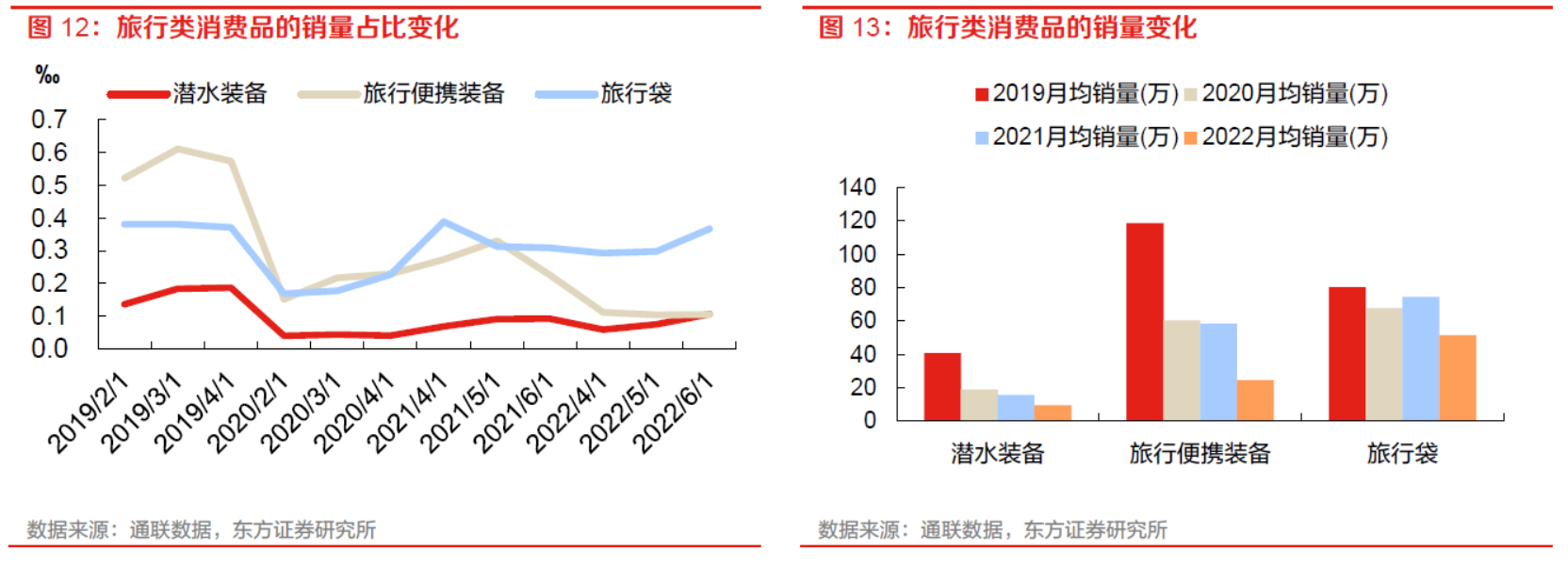 另外,东北证券称旅行相关消费品受影响的程度减弱,恢复的速度也在加快,6月潜水装备、旅行袋的销量占比已超过去年同期。不过,占比变化并不能反映全貌——疫情后旅行类消费品持续低迷。2021年潜水装备、旅行便携设备、旅行袋的销量分别相当于疫情之前2019年的39%、49%和93%,2022年分别相当于2019年的23%、21%和64%。