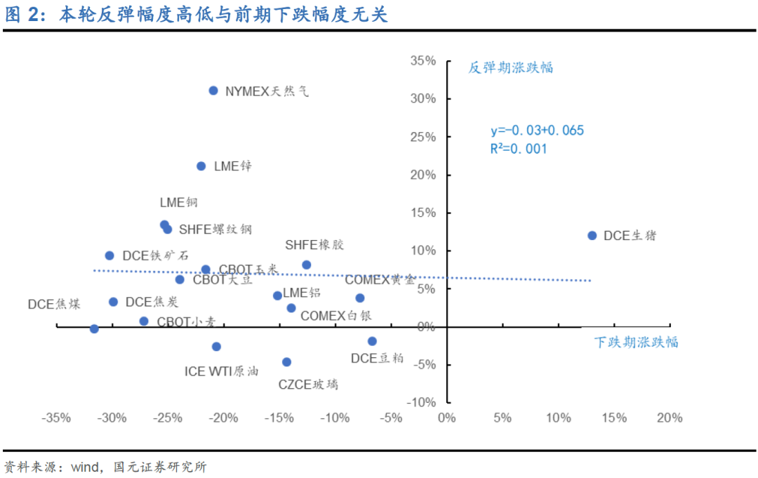 我们先确认本轮反弹幅度是否与前期下跌幅度有关。从下图可知,本轮反弹幅度大的品种,并不一定是前提涨幅高的品种,如天然气、锌在本轮反弹中涨幅位居前二,但是在此前的下跌中跌幅并不是非常显著;再比如焦煤、焦炭、小麦,在本轮商品的集体反弹中几乎没有表现(涨幅微正甚至下跌),但是在下跌期中却跌幅居前,幅度都在30%附近。由此可见,本轮各品种反弹幅度的大小,与前期下跌幅度的大小无关。