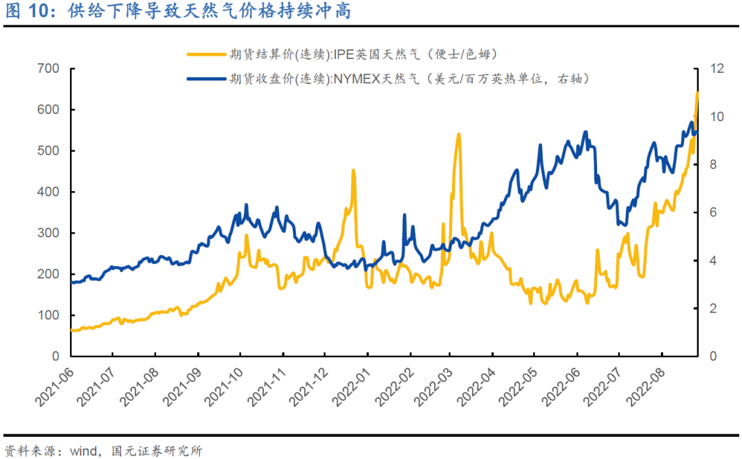 天然气价格的持续冲高是近期市场关注的焦点。俄罗斯本月底暂停北溪管道供气3日,受此影响,天然气价格暴力拉升;可以说,从去年冬季的欧洲电荒到今年的俄乌冲突,北溪事件升级以及当下的俄罗斯“合理断气”威胁,天然气价格持续大幅上涨的驱动仍主要由供应端主导。