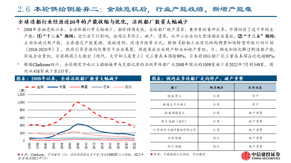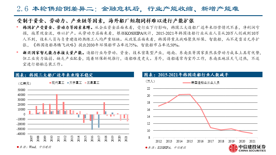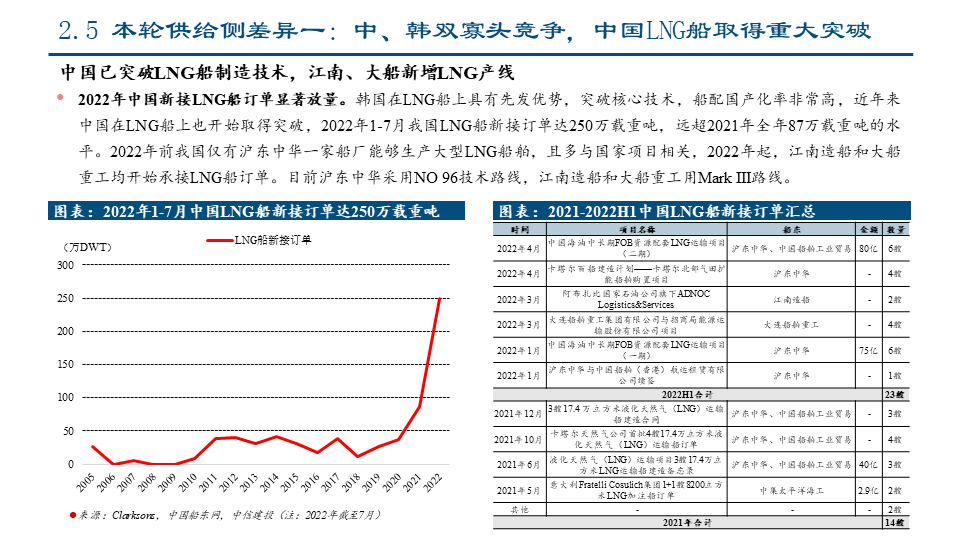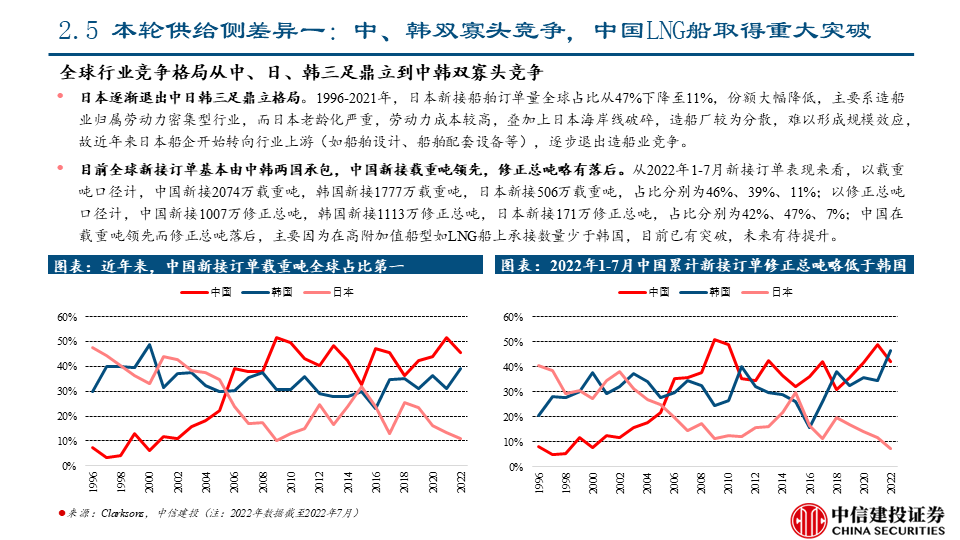 供给端:金融危机后,行业经历长达10年的产能收缩与优化,且新增产能难,未来新接订单将集中在中韩两国的头部船厂。