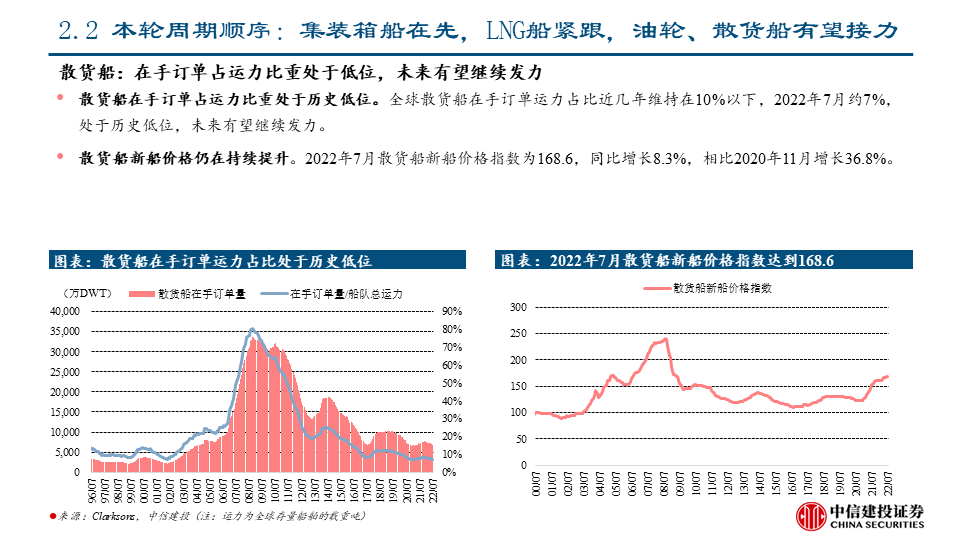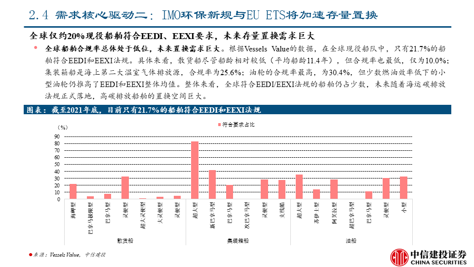 需求端:分船型来看,下游航运景气传导带动船舶新接订单大幅增长,集装箱船需求率先爆发,LNG船随后兴起,油轮、散货船目前在手订单占运力比重均处低位,未来有望接力。另外,船龄老化、环保新规是本轮周期的核心驱动力,将带动未来需求不断向上,船厂在手订单有望持续提升。