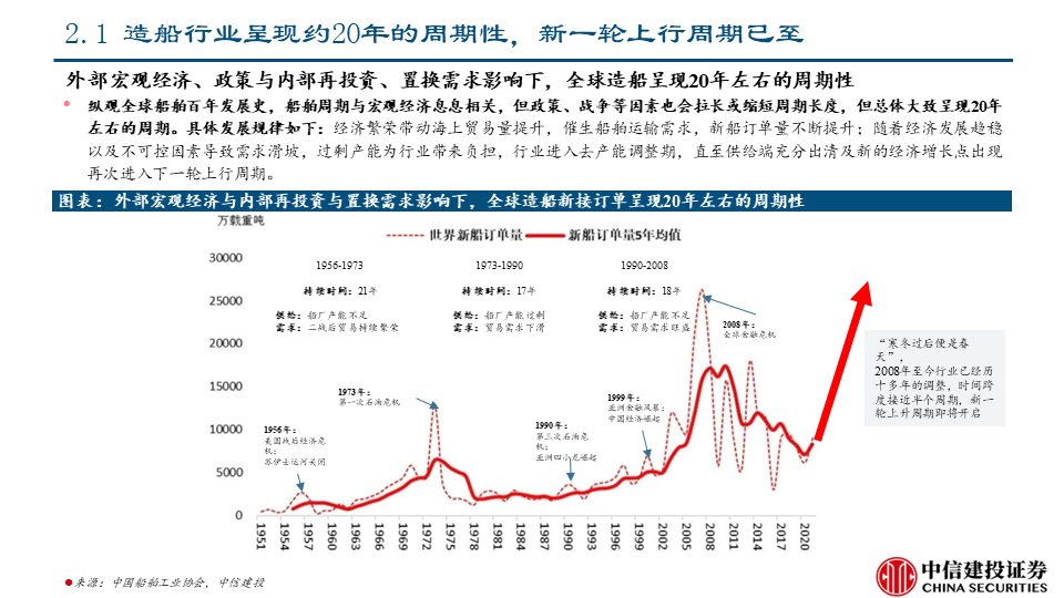 外部宏观经济、政策与内部再投资、置换需求影响下,全球造船呈现20年左右的周期性