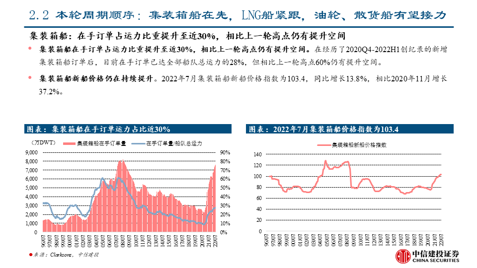 头部船厂排产已至2025年以后,甚至2027年,本轮新船价格上升幅度近30%,行业供需缺口持续扩大的背景下,预计本轮新船价格有望再创新高。