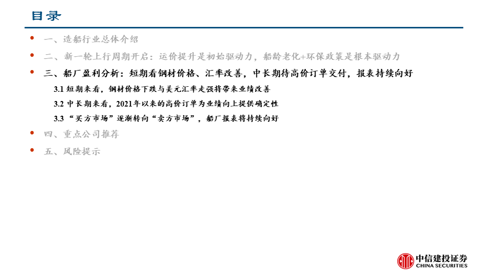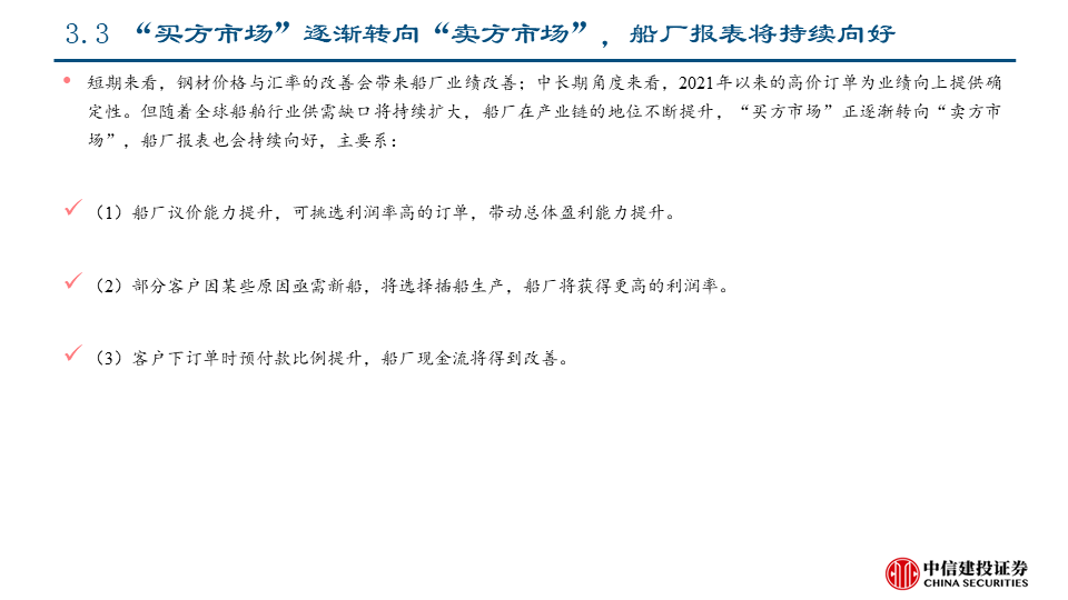 短期来看,钢材价格与汇率的改善会带来船厂业绩改善;中长期角度来看,2021年以来的高价订单为业绩向上提供确定性。但随着全球船舶行业供需缺口将持续扩大,船厂在产业链的地位不断提升,“买方市场”正逐渐转向“卖方市场”,船厂报表也会持续向好。