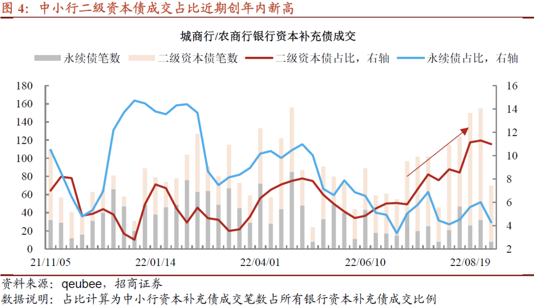 第二,金融债的偏好抬升,这与产业债拉久期是一体两面,同样有降低风险敞口的意味。一方面,城商行及农商行二级资本债成交笔数占银行资本补充债比例接近12%,达到去年11月以来新高。