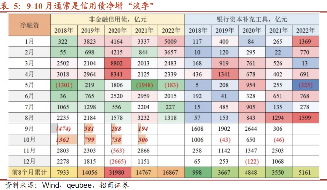 首先,参考过往,9-10月通常是票息资产净增“淡季”,这是发行人进入补半年报财务数据使然。而今年不同之处在于,政策端鼓励部分发行人债券融资,包括能源保供特别债2000亿,带增信工具的地产债等,叠加TLAC工具有望在落地,一系列“动作”会否催化供给压力?