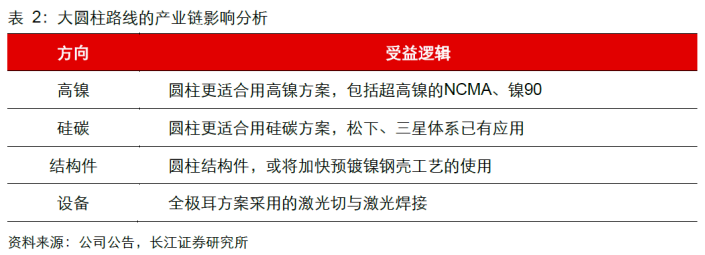 1)高能量密度材料的导入,例如三星SDI圆柱电池将采取镍91方案,LG化学的圆柱电池将采用NCMA方案,松下、三星SDI的圆柱此前已导入了硅碳负极,因而相关标的有望受益。