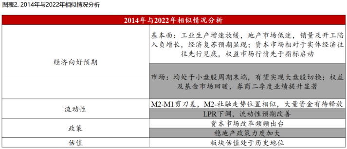 2)从流动性方面看:当下与2014年的M2-M1剪刀差走势相似,M2-社融剪刀差扩大,LPR下调,流动性宽松预期增强,大量资金有待入市。