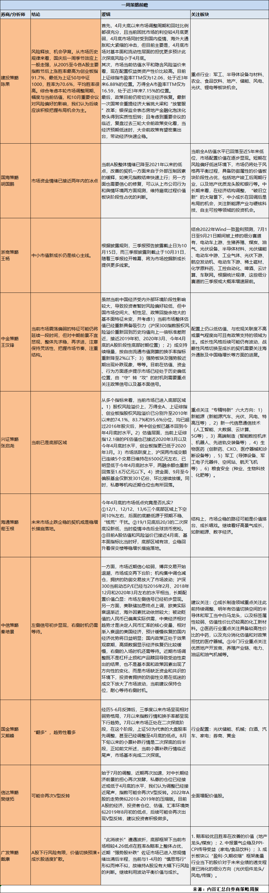 本周多家策略分析师偏向于认为A股逼近底部。看好的方向上三季报预增、高景气、价值股等都有提及。
