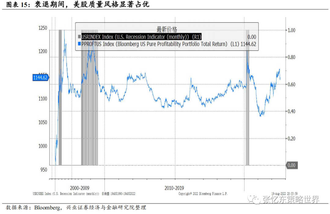 结构层面,紧缩交易的后期,依然维持质优成长相对占优的判断。如果美国最终走向NBER定义的衰退,对于美股而言,分子端面临业绩预期下调压力,分母端无风险利率和风险溢价则呈现此消彼长,这一风险特征之下,美股投资把握质优成长。