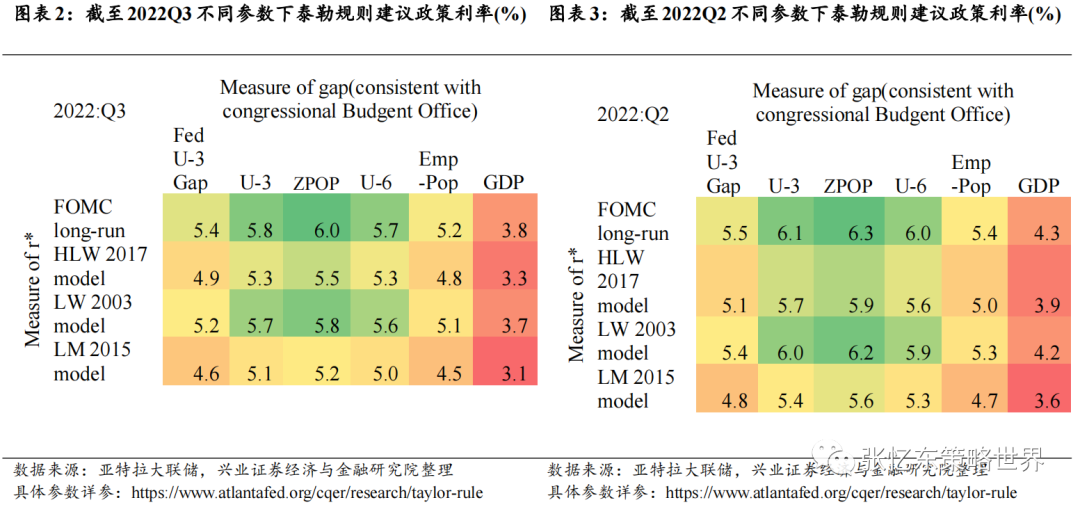 我们曾在20220628《动荡的世界,复苏的赢家》引用了保守参数设定下泰勒规则利率给出了10Y美债收益率波动中枢3.5%的判断;当前,考虑其他参数情形下的泰勒规则利率中位数为5.2%、均值为5%,与9月FOMC散点图2023年政策利率预期中位数4.6%相差60bp、40bp。