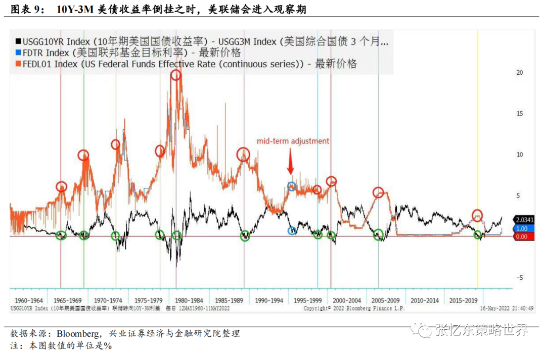 首先,60年代以来,联储一以贯之的货币政策实施框架的指示是:10Y-3M美债收益率倒挂之时,美联储货币政策会迎来边际变化。按照当前的市场预期,11月FOMC会后,10Y-3M美债利差将会迎来本轮加息的首次倒挂。