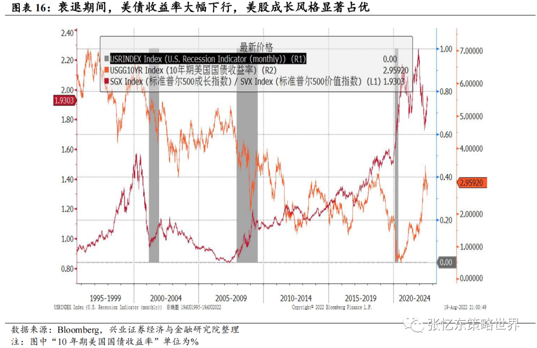 结构层面,紧缩交易的后期,依然维持质优成长相对占优的判断。如果美国最终走向NBER定义的衰退,对于美股而言,分子端面临业绩预期下调压力,分母端无风险利率和风险溢价则呈现此消彼长,这一风险特征之下,美股投资把握质优成长。以史为鉴,回顾2000年、2008年、2020年三次衰退,美股成长风格(高长期业绩增速)、质量风格(高盈利能力如高ROE、利润率)占优。