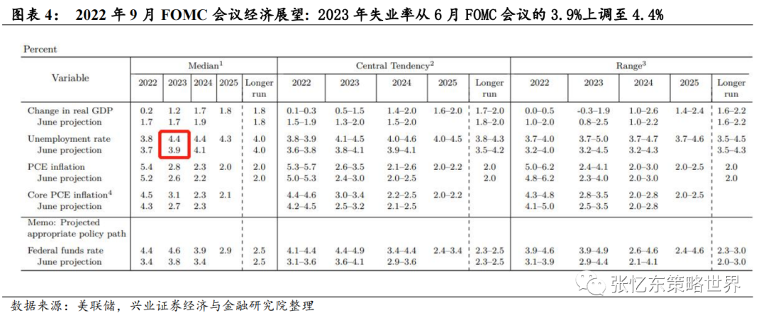年初以来我们强调的“衰退换通胀”情形概率不断增加。9月FOMC将2023年失业率从6月FOMC会议的3.9%上调至4.4%,对失业率提升的容忍度在提高。