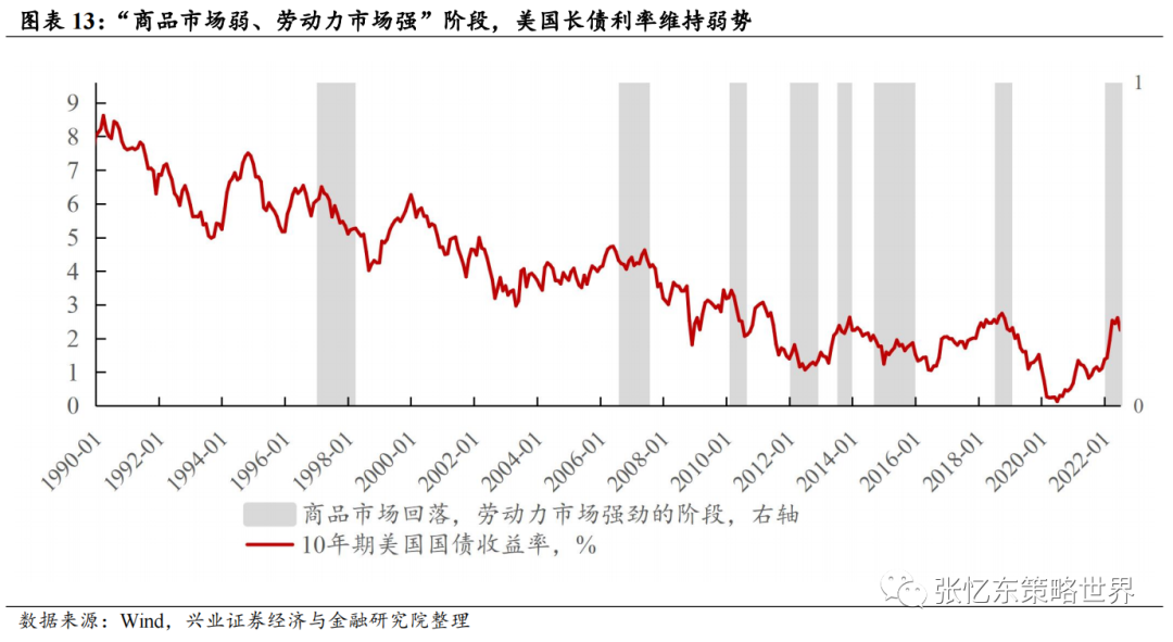 其次,从美国经济的格局来看,目前美国经济呈现:商品市场弱、劳动力市场强。以史为鉴,这种经济格局下,美国长端利率往往呈现弱势。